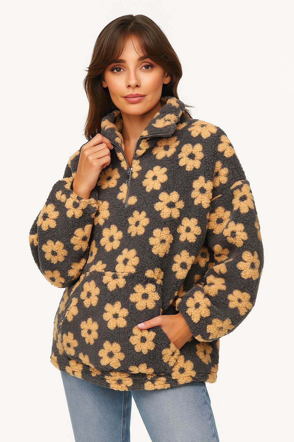 Sa matière douce façon laine, son imprimé floral et sa coupe relax créent un look charmant et confortable — parfait pour relever ces journées grises où la ville est couverte de neige.